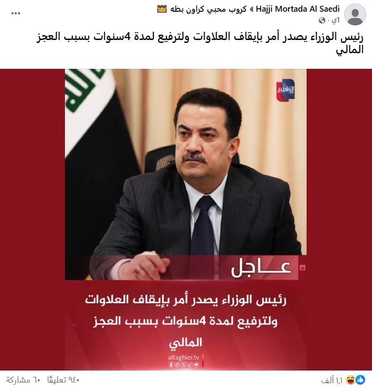 تداولت صفحات على مواقع التواصل الاجتماعي، وخصوصاً على منصّة فيسبوك، خبراً نصّه (دون تصرّف): “رئيس الوزراء يصدر أمر بإيقاف العلاوات ولترفيع لمدة 4سنوات بسبب العجز المالي”. وحصد المنشور مئات التفاعلات في منشورات متعددة على منصّة فيسبوك.