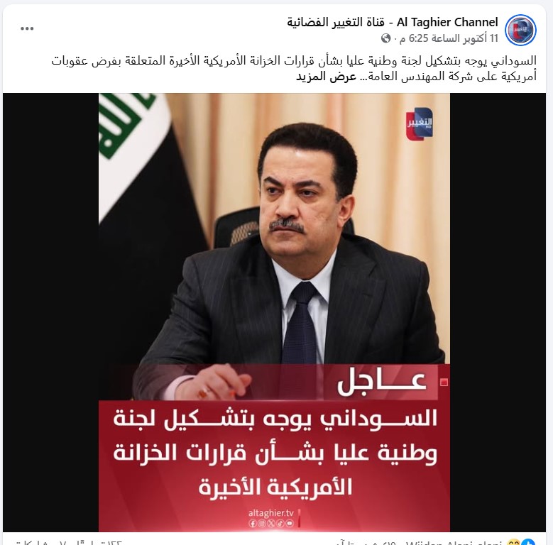 وبعد فحص الصورة المرافقة للادّعاء، تبيّن أنها مفبركة، حيث تم استخدام قالب أخبار قناة “التغيير”، التي لم تنشر أي منشور مشابه، بل أن الصورة الأصلية نشرت يوم 11 تشرين الأول الجاري، في صفحة القناة، ونص الخبر فيها “السوداني يوجه بتشكيل لجنة وطنية عليا بشأن قرارات الخزانة الأمريكية الأخيرة المتعلقة بفرض عقوبات أمريكية على شركة المهندس العامة”، وليس كما تم تداوله.