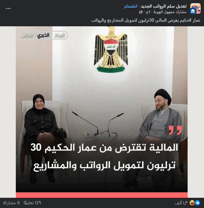 تداولت صفحات على مواقع التواصل الاجتماعي، وخصوصاً على منصة فيسبوك، خبراً بمزاعم أن وزارة المالية اقترضت مبلغ قدره 30 تريليون دينار عراقي من زعيم تيار الحكمة، عمار الحكيم، من أجل تمويل الرواتب والمشاريع. وحصد الادعاء أكثر من 1700 تفاعل في منشور واحد فقط على منصة فيسبوك.