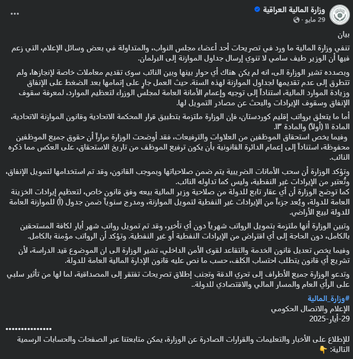 وعند مراجعة صفحات وزارة المالية، اتضح أنها بينت في 29 أيار الماضي، أنها “ملتزمة بتمويل الرواتب شهرياً دون أي تأخير، وقد تم تمويل رواتب شهر أيار لكافة المستحقين بالكامل، دون الحاجة إلى أي اقتراض من الإيرادات النفطية أو غير النفطية. وتؤكد أن الرواتب مؤمنة بالكامل”.