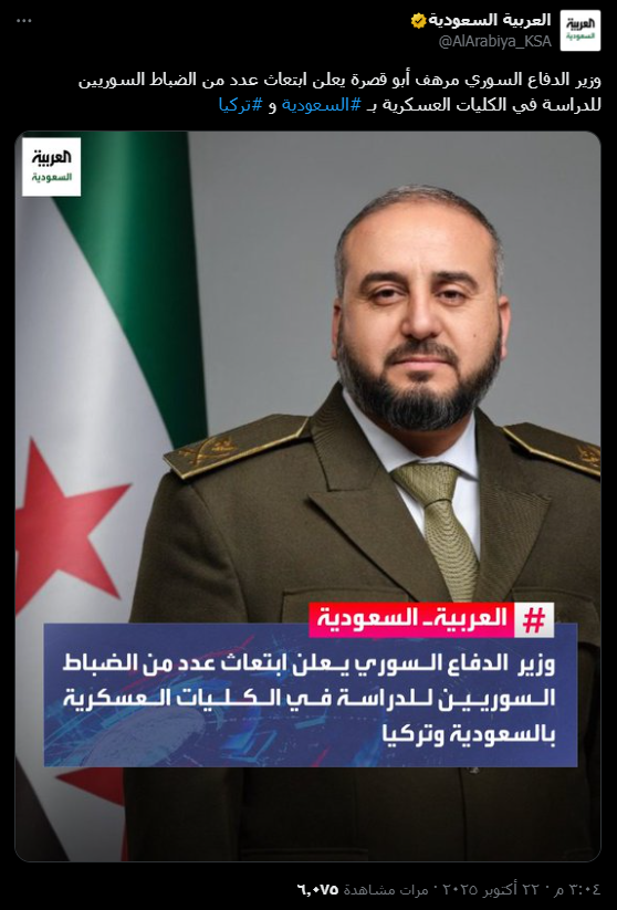 وبعد فحص الصورة المتداولة للادّعاء، تبين أنها مفبركة، حيث تم استخدام قالب أخبار “العربية السعودية”، التي لم تنشر أي منشور مشابه في صفحاتها، واتضح أن الصورة الأصلية نشرت يوم 22 تشرين الأول الجاري، ونصّ الخبر فيها على: “وزير الدفاع السوري يعلن ابتعاث عدد من الضباط السوريين للدراسة في الكليات العسكرية بالسعودية وتركيا”. ما ينفي صحة الادعاء المتداول.