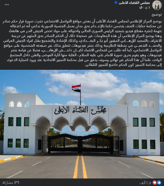 وينتشر هذا الادعاء الزائف، في سياق قضية الشاب السوري “مجد سليمان أحمد حسن”، الذي تداول ناشطون على مواقع التواصل الاجتماعي، خبراً حول الحكم عليه بالإعدام في العراق، على خلفية “نشره صور الرئيس السوري الانتقالي أحمد الشرع”، الأمر الذي نفاه القضاء العراقي بالقول إن الحكم تم اتخاذه على خلفية تمجيده بالإرهاب والتحريض ضد الجيش والقوات الأمنية العراقية.