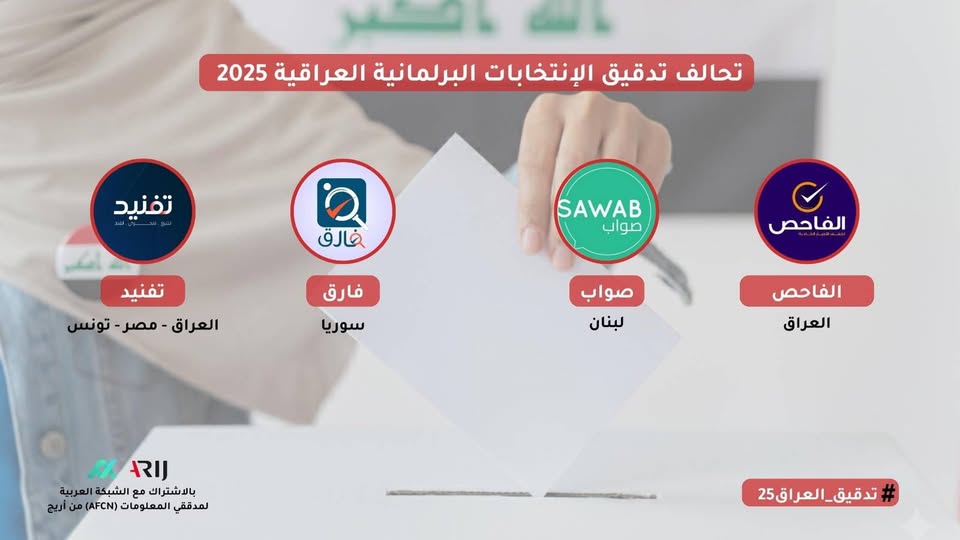 تعلن منصات الفاحص، وتفنيد، وصواب وفارق عن تأسيس تحالف مهني لتدقيق المعلومات المتعلقة بالانتخابات البرلمانية العراقية لعام 2025، بالشراكة مع الشبكة العربية لمدققي المعلومات (AFCN) التابعة لـ أريج.