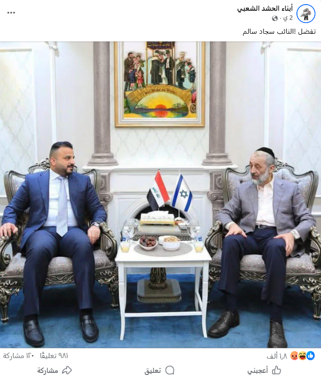 تداولت صفحات على مواقع التواصل الاجتماعي، وخصوصاً على منصة فيسبوك، صورة بمزاعم أنها تظهر المرشح عن تحالف “البديل” النائب سجاد سالم خلال لقاء رسمي مع شخصية إسرائيلية”. وحصد الادعاء آلاف التفاعلات في منشورات متعددة على منصّة فيسبوك.