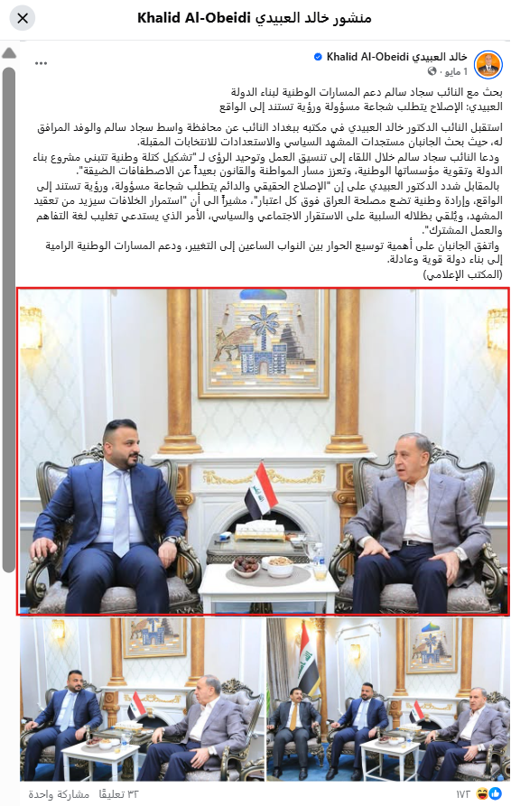 بعد التحقيق من قبل فريق الفاحص، والبحث العكسي عن الصورة، تبين أنها مفبركة، حيث تعود الصورة الأصلية إلى تاريخ 1 أيار الماضي، وهي للقاء جمع بين النائب سالم والنائب خالد العبيدي في مكتب الأخير، لبحث مستجدات المشهد السياسي والاستعدادات للانتخابات المقبلة.