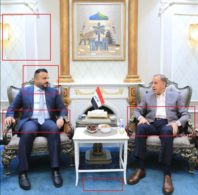 وتمت فبركة الصورة من خلال إضافة علم الاحتلال الإسرائيلي على الطاولة بينهما، واستبدال وجه خالد العبيدي بوجه سياسي إسرائيلي يدعى “أرييه درعي“، وتغيير اللوحة المعلقة خلفهما، بالإضافة إلى تغيير بعض الألوان مثل لون الحذاء التي يرتديها العبيدي.