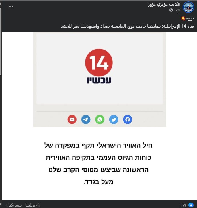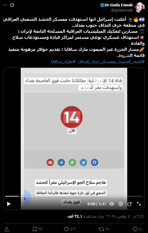 تداولت صفحات على مواقع التواصل الاجتماعي، وخصوصاً على منصتي فيسبوك وإكس، وبالتزامن مع وقوع انفجار في أحد مقرات الحشد الشعبي ببغداد، تداولت خبراً بمزاعم أن قوات الاحتلال الإسرائيلي استهدفت معسكراً للحشد الشعبي في منطقة جرف النداف العاصمة بغداد. ونقلت الصفحات الخبر عن القناة “14 الإسرائيلية”. وحصد الادعاء مئات التفاعلات في منشورات متعددة على منصتي فيسبوك وإكس.