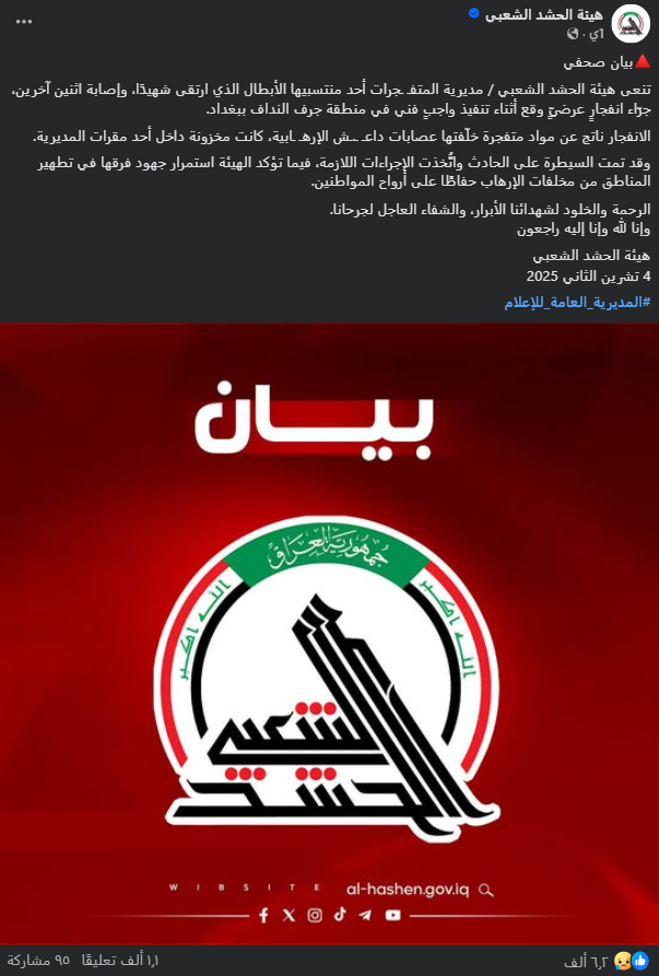 وبالبحث في صفحة هيئة الحشد الشعبي الرسمية على فيسبوك، تبين أنها نشرت بياناً رسمياً أوضحت من خلاله أن انفجاراً عرضياً وقع أثناء تنفيذ واجب فني في منطقة جرف النداف ببغداد.
