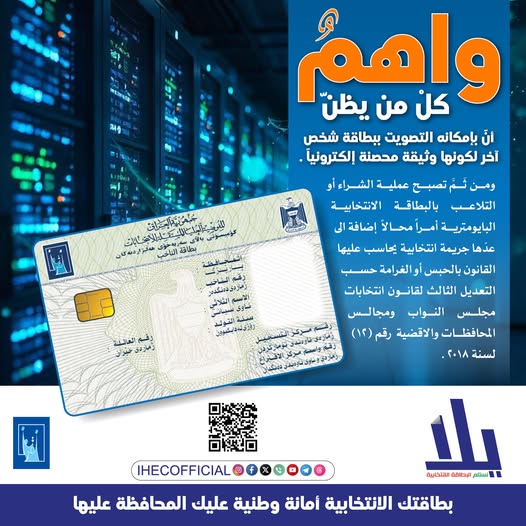 وتابعت، بأنه “واهم كل من يظن أن بإمكانه التصويت ببطاقة شخص آخر، لكونها وثيقة محصنة إلكترونياً، ومن ثم تصبح عملية الشراء أو التلاعب بالبطاقة الانتخابية البايومترية أمراً محالاً، إضافة إلى عدّها جريمة انتخابية يحاسب عليها القانون بالحبس أو الغرامة حسب التعديل الثالث لقانون انتخابات مجلس النواب ومجالس المحافظات والأقضية رقم (12) السنة 2018”.