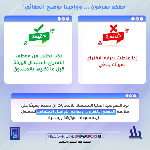 في ظل موسم انتخابات تنافسي ومتشنج، لا تقتصر المنافسة في الساحة السياسية فحسب، بل على صفحات التواصل الاجتماعي أيضاً، حيث تنتشر الإشاعات والادعاءات المضللة بسرعة تفوق الأخبار الرسمية. وفي خضم هذه الفوضى، يبرز دور الجهات الرسمية كالمفوضية العليا المستقلة للانتخابات، بدور هام في توعية الجمهور وتفنيد الادعاءات التي تثير الشك أو تضعف الثقة بالعملية الانتخابية، بصفتها مصدراً أساسياً في العملية الانتخابية.