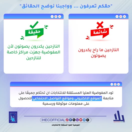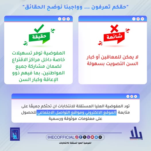 المفوضية: “المفوضية توفر تسهيلات خاصة داخل مراكز الاقتراع لضمان مشاركة جميع المواطنين، بمن فيهم ذوو الإعاقة وكبار السن”.