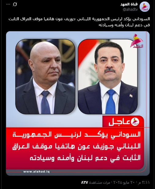 وبالبحث العكسي عن صورة الادعاء المرفق بقالب قناة “العهد”، اتضح أنها مفبركة وتم التلاعب بها بأحد برامج تعديل الصور، إذ نشرت الصورة الأصلية في حساب قناة العهد على منصة إكس يوم 20 أيار 2025، واحتوت على خبر مفاده: “السوداني يؤكد لرئيس الجمهورية اللبناني جوزيف عون هاتفيا موقف العراق الثابت في دعم لبنان وأمنه وسيادته”.