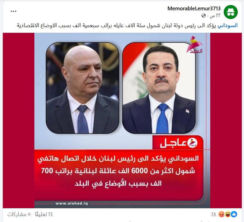 تداولت صفحات على مواقع التواصل الاجتماعي، وخصوصاً على منصة فيسبوك، خبران متشابهان في المضمون، مفادهما شمول 6000 عائلة لبنانية براتب قدره 700 ألف دينار عراقي بسبب الأوضاع الاقتصادية في لبنان وبأمر من رئيس الوزراء السوداني.