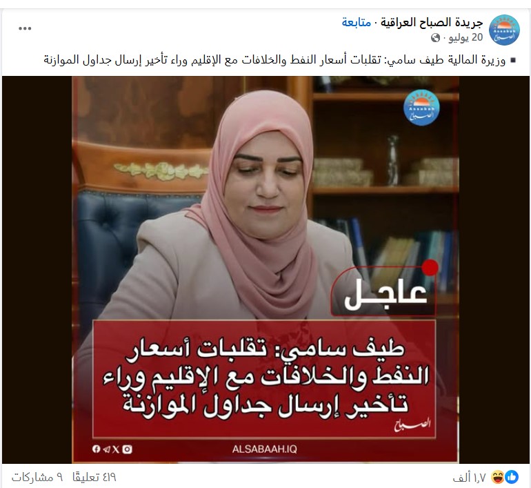 أما الصورة الاصلية الثانية بقالب “الصباح”، فقد نشرت في حساب جريدة الصباح، يوم 20 تموز 2025, وتضمنت نص مفاده: “وزيرة المالية طيف سامي: تقلبات أسعار النفط والخلافات مع الإقليم وراء تأخير إرسال جداول الموازنة”.