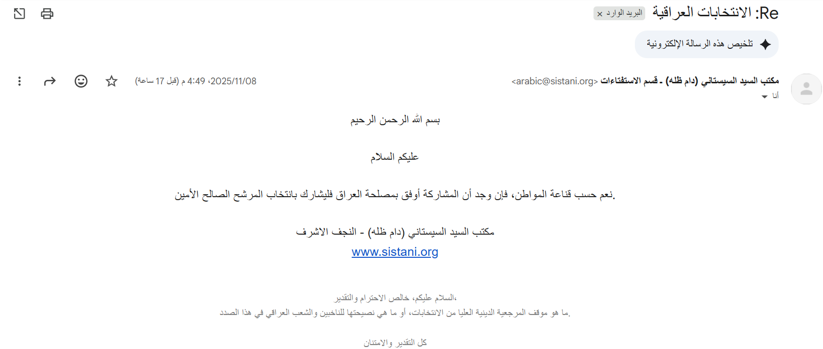 وبناءً على هذا الرد، يتضح أن المرجعية لم تُصدر توجيهاً عاماً بالمشاركة أو بالمقاطعة، وإنما تركت القرار لضمير المواطن وقناعته الشخصية، داعية إلى اختيار “الصالح الأمين” إذا رأى المواطن أن المشاركة تصبّ في مصلحة البلاد.