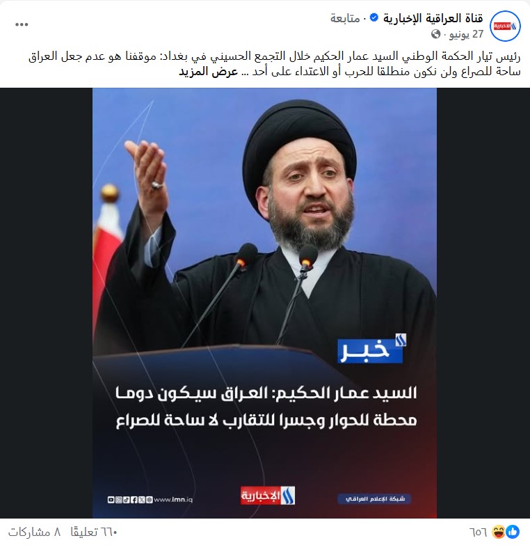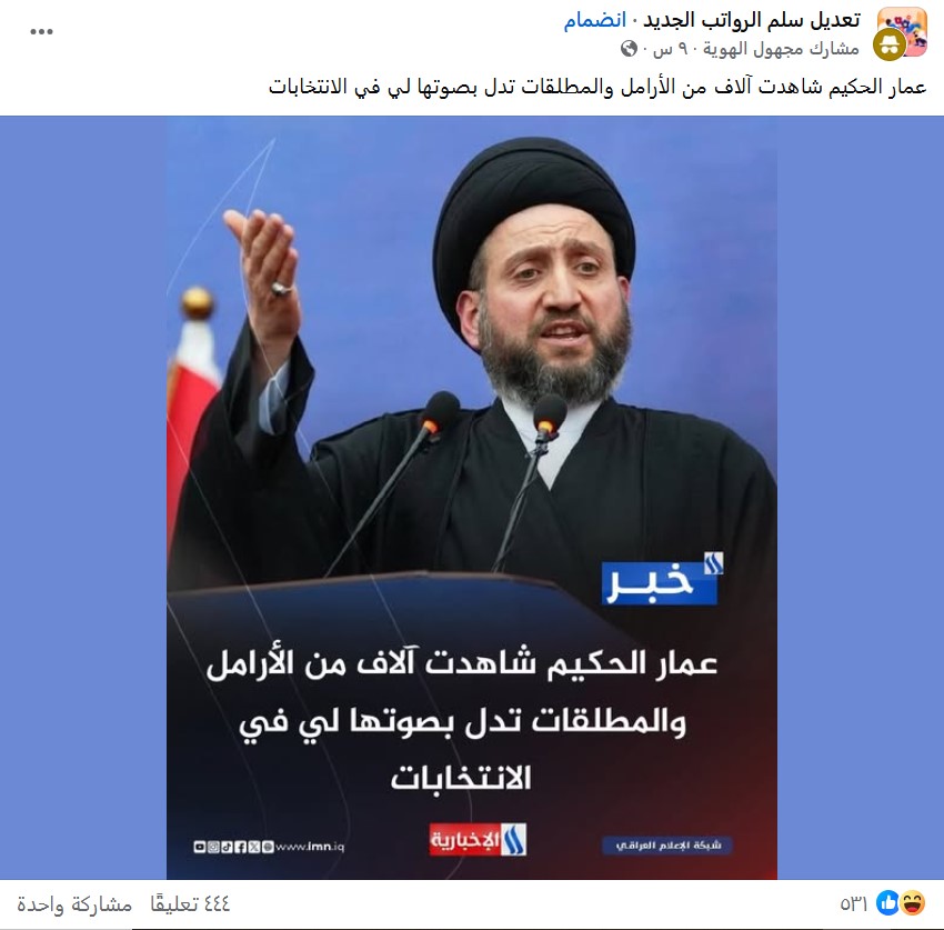 تداولت صفحات على مواقع التواصل الاجتماعي، وخصوصاً على منصة فيسبوك، خبراً مع صورة تحمل قالب قناة “العراقية الإخبارية” ومرفقة بنص (دون تصرّف): “عمار الحكيم شاهدت آلاف من الأرامل والمطلقات تدل بصوتها لي في الانتخابات“. وحصد الادعاء مئات التفاعلات على منصات التواصل الاجتماعي.