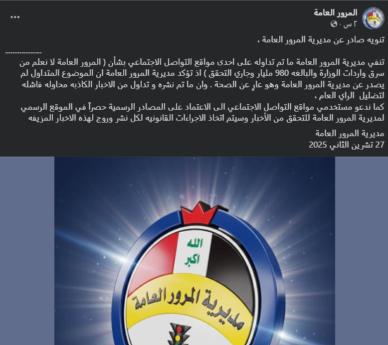 تداولت حسابات على مواقع التواصل الاجتماعي، وخصوصاً على منصة فيسبوك، خبراً بمزاعم (دون تصرّف): “المرور العامة لا نعلم من سرق واردات الوزارة والبالغة 980 مليار وجاري التحقيق”. وحصد الادعاء أكثر من 14 ألف تفاعل في منشور واحد فقط على منصة فيسبوك.