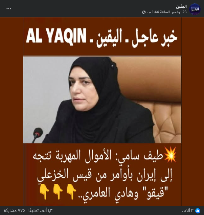 تداولت حسابات على مواقع التواصل الاجتماعي، وخصوصاً على منصة فيسبوك، تصريحاً منسوباً إلى وزيرة المالية العراقية طيف سامي، بمزاعم أنها قالت (دون تصرّف): “طيف سامي: الأموال المهربة تتجه إلى إيران بأوامر من قيس الخزعلى ‘قيقو’ وهادي العامري”. وحصد الادعاء أكثر من 4 آلاف تفاعل في منشور واحد فقط على منصة فيسبوك.