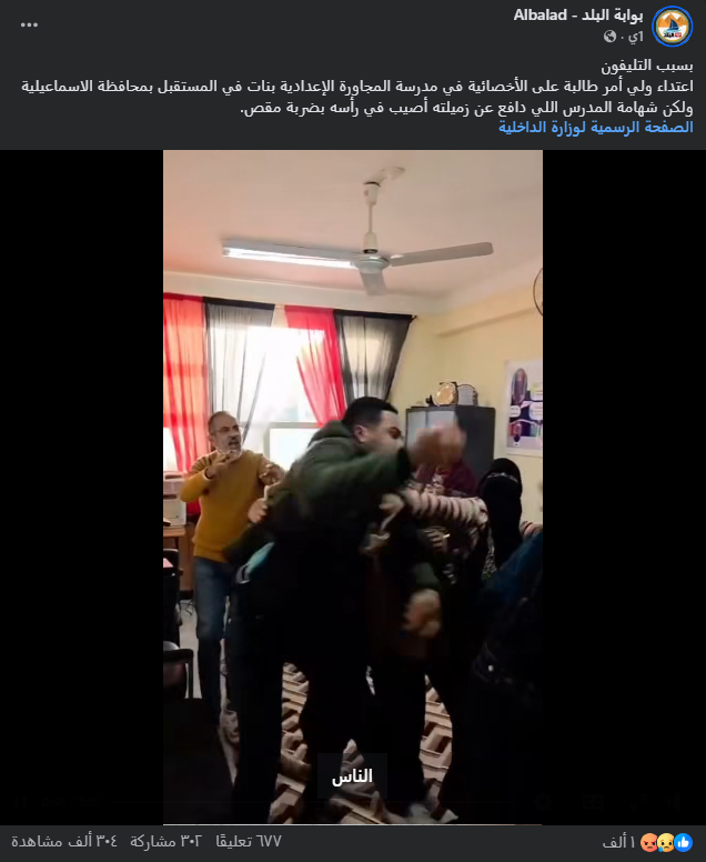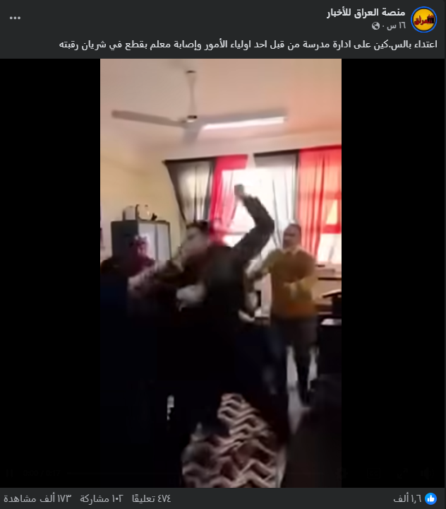 نشرت صفحات على مواقع التواصل الاجتماعي في العراق، وخصوصاً على منصة فيسبوك، مقطع فيديو بمزاعم أنَّه يظهر اعتداء بالسكين على إدارة إحدى المدارس في العراق، وأرفق بنص مفاده (دون تصرّف): “اعتداء بالس.كين على ادارة مدرسة من قبل احد اولياء الأمور وإصابة معلم بقطع في شريان رقبته”. وعلى الرغم من أن مصادر الادّعاء لم تشر إلى أنه في العراق، إلا أن نشره من قبل صفحات عراقية جذب تفاعل المستخدمين ظنّاَ منهم أن الواقع في العراق. وحصد الفيديو مئات التفاعلات في منشورات متعددة على منصة فيسبوك.
