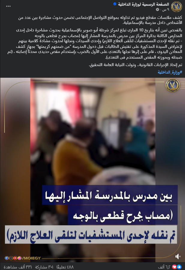 ووفقاً لبيان وزارة الداخلية المصرية، فإن الحادثة وقعت في إدارة “أبو صوير” بمحافظة الإسماعيلية، وتعرّض على إثرها أحد المدرسين إلى جرح قطعي بالوجه، وتم نقله لإحدى المستشفيات لتلقى العلاج.