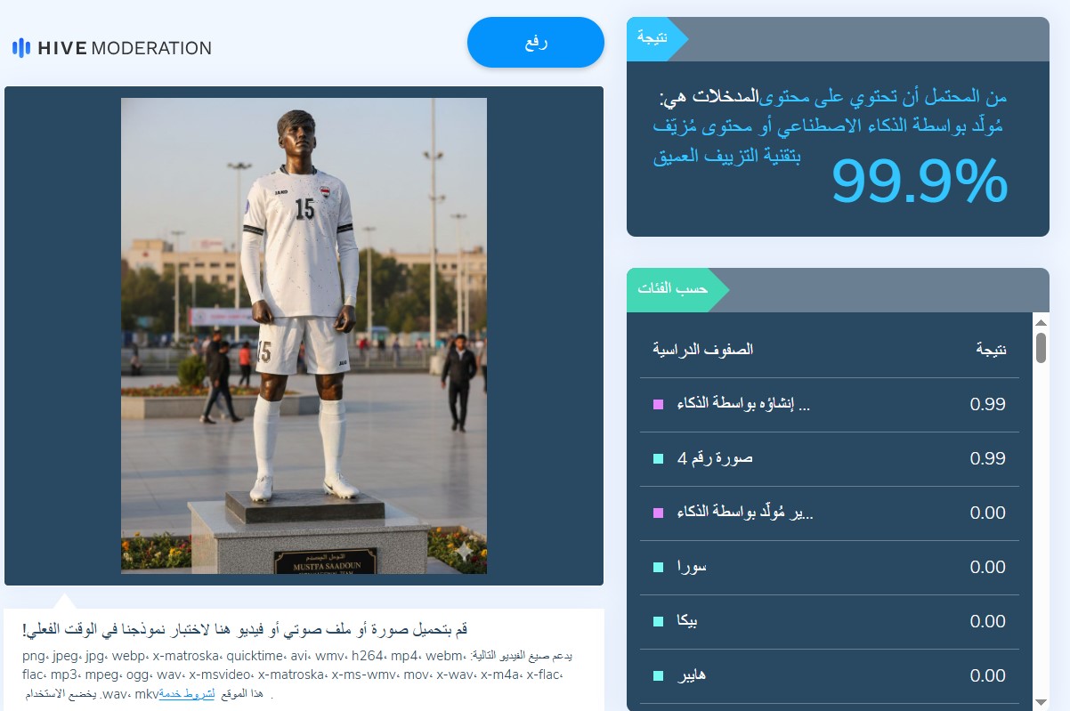وبعد تحليل الصورة باستخدام أداة (hive moderation) المختصة بفحص المحتوى المولد بالذكاء الاصطناعي، أظهرت نتيجة الفحص أنَّ الصورة مولدة بنسبة 99.9% بالذكاء الاصطناعي.