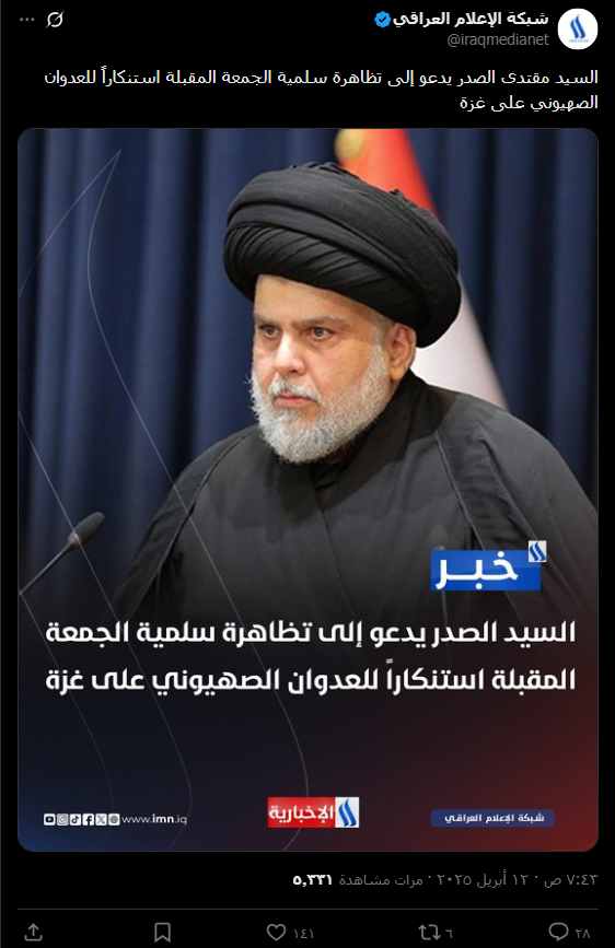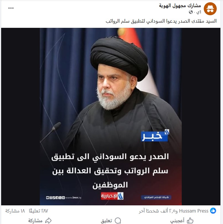 نشرت صفحات على مواقع التواصل الاجتماعي، وخصوصاً على منصة فيسبوك، صورة تحمل قالب قناة “العراقية الإخبارية” ومرفقة بنص (دون تصرّف): “السيد مقتدى الصدر يدعوا السوداني لتطبيق سلم الرواتب“. وحصد الادعاء الاف التفاعلات على منصة فيسبوك.