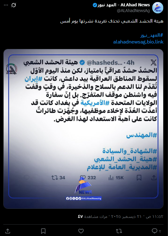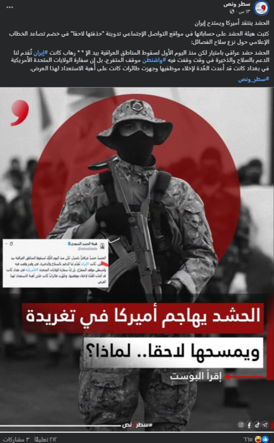 نشرت صفحات على مواقع التواصل الاجتماعي، وخصوصاً على منصتي فيسبوك وإكس، خبراً مفاده أن هيئة الحشد الشعبي نشرت منشوراً عبر حسابها الرسمي مدحت فيه إيران وذمّت الولايات المتحدة الأميركية، وثم حذفته لاحقاً. وحصد الخبر آلاف التفاعلات في منشورات متعددة على مواقع التواصل الاجتماعي.