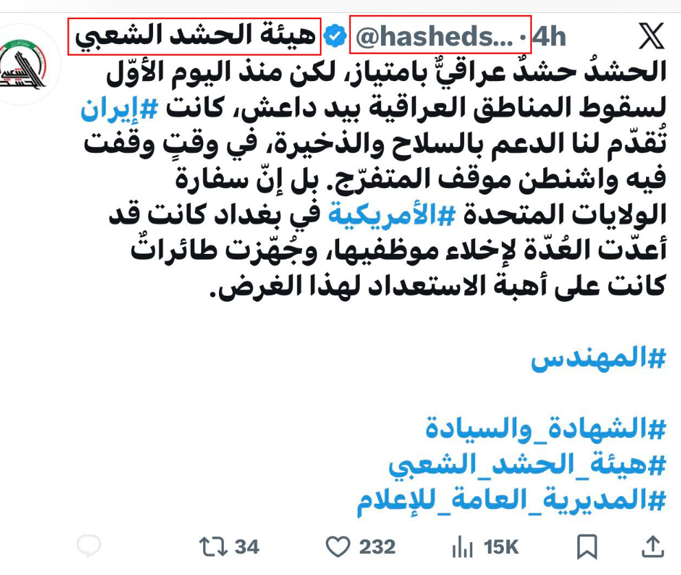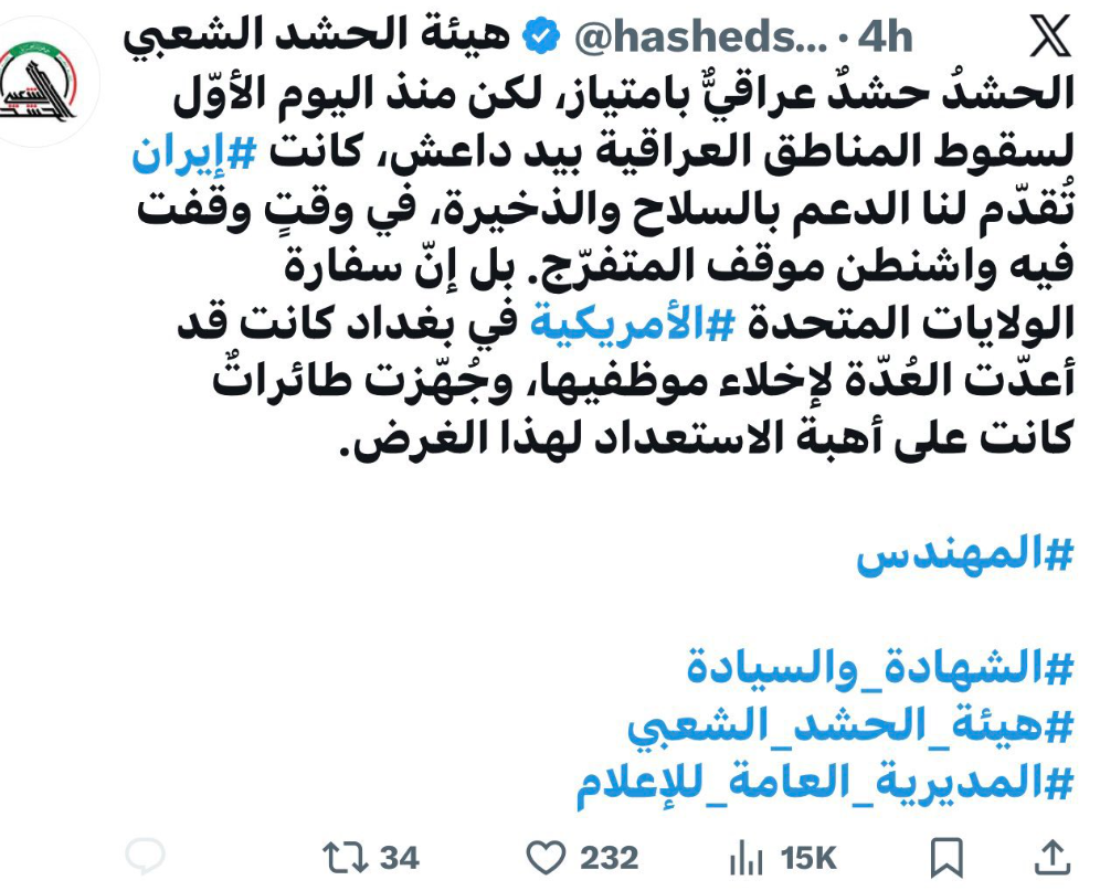 وجاء في لقطة شاشة المنشور، نص مفاده (دون تصرّف): “الحشد حشد عراقي بامتياز لكن منذ اليوم الأول لسقوط المناطق العراقية بيد داعش، كانت #إيران تُقدم لنا الدعم بالسلاح والذخيرة في وقت وقفت فيه واشنطن موقف المتفرج. بل إن سفارة الولايات المتحدة #الأمريكية في بغداد كانت قد أعدت العُدة لإخلاء موظفيها وجهزت طائرات كانت على أهبة الاستعداد لهذا العرض”.
