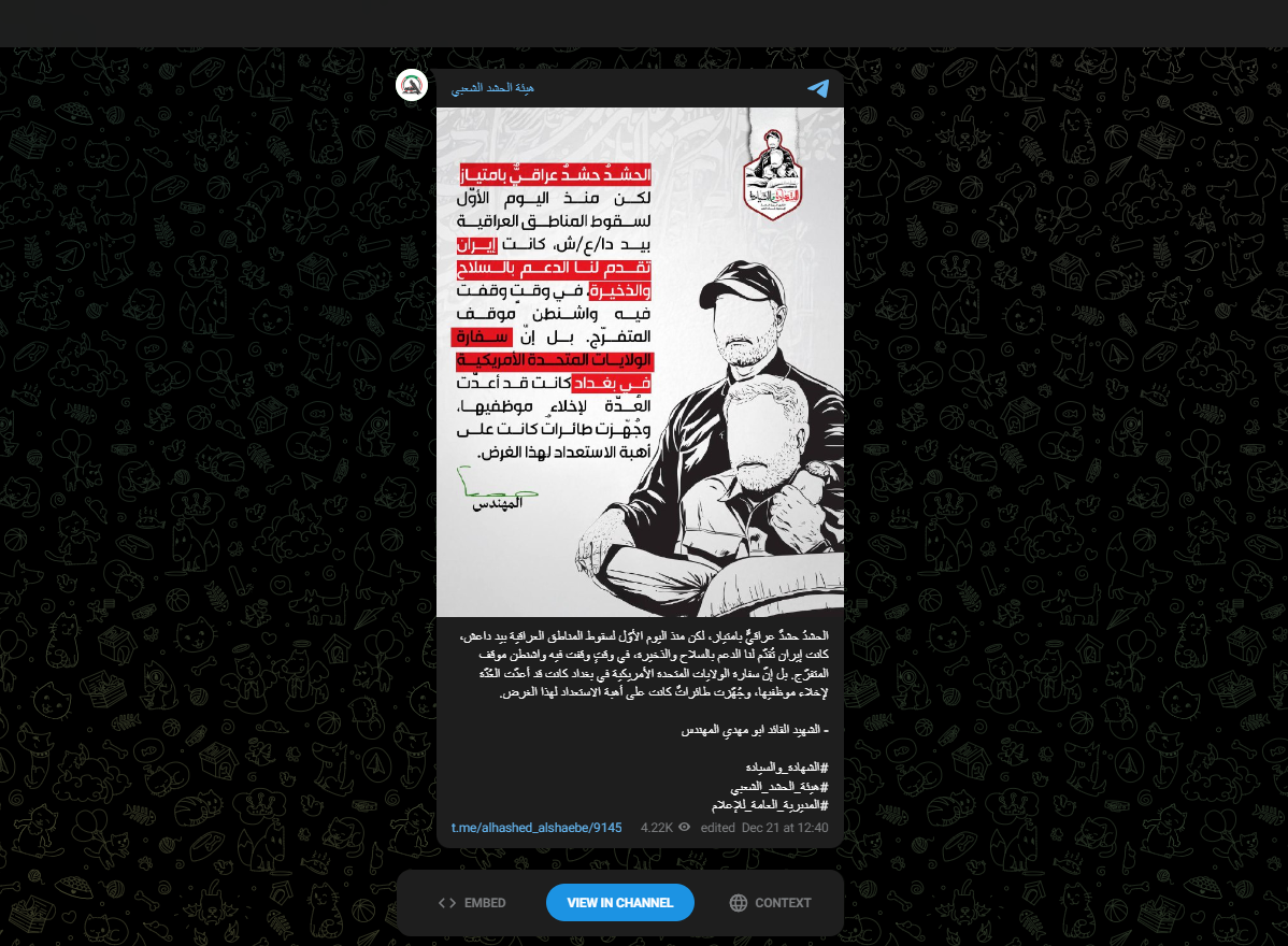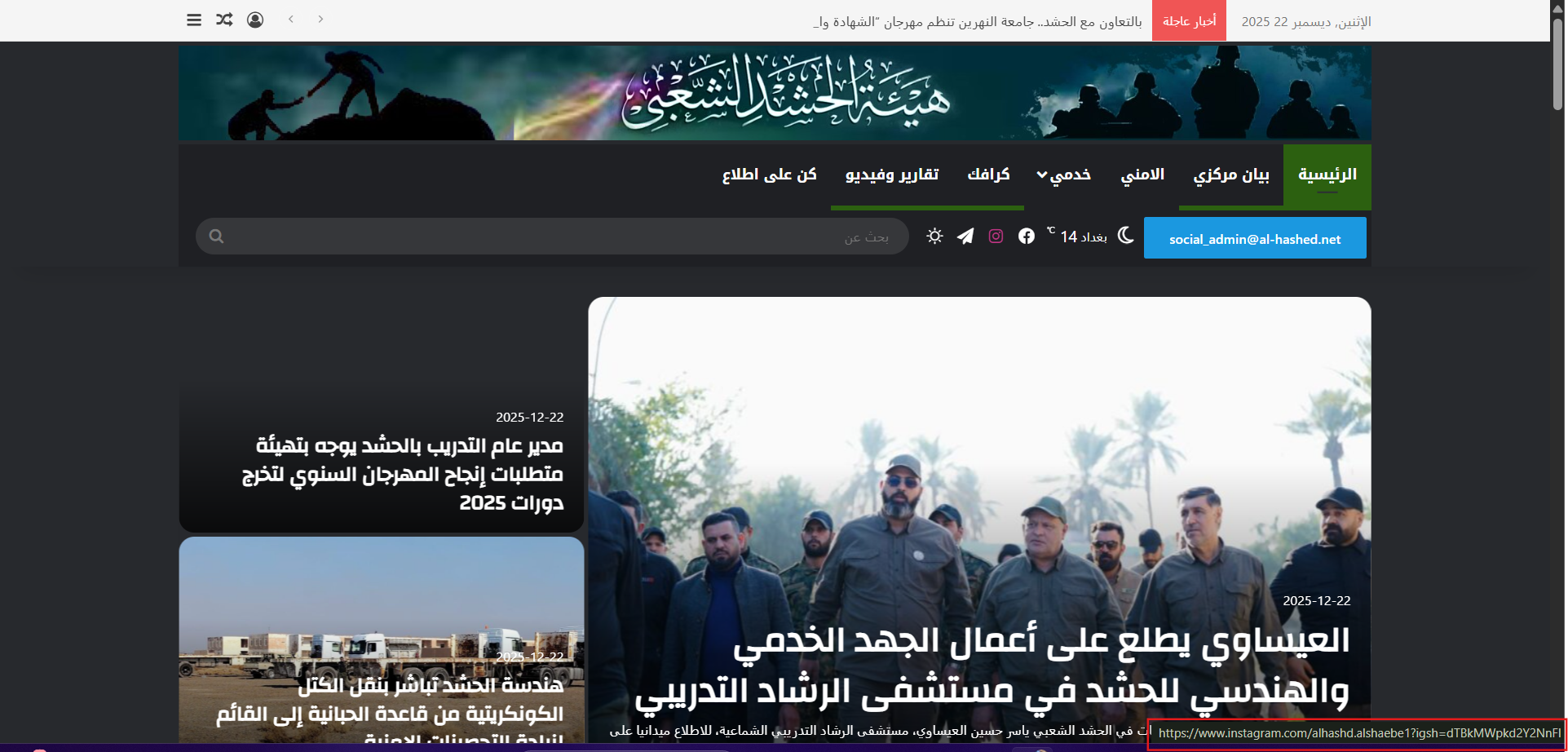 راجعنا الموقع لرسمي لهيئة الحشد الشعبي، ووجدنا أنه لم ينشر شيء مشابه، ولكن بعد أن توجهنا إلى الحسابين الرسميين للحشد على منصتي إنستغرام وتيليغرام -والمشار إليهما في الموقع-، تبين أنه بالفعل تم نشر المنشور يوم 21 كانون الأول الجاري، لكن ما أحدث لبساً لدى المستخدمين، هو أن الهيئة لم تنشره في الموقع أو في حسابي فيسبوك وإكس الرسميين.