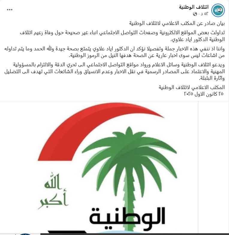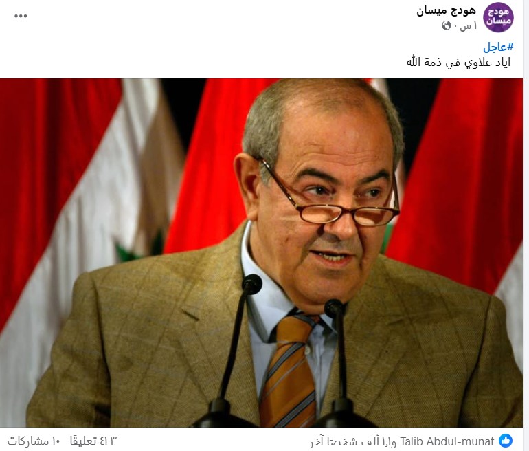 نَشرت صفحاتٌ على مواقع التواصل الاجتماعي، وخصوصاً على منصة فيسبوك، خبراً يزعم وفاة زعيم “ائتلاف الوطنية”، السياسي العراقي إياد علاوي. وحصد الادعاء آلاف التفاعلات في منشورات متعددة على منصة فيسبوك.
