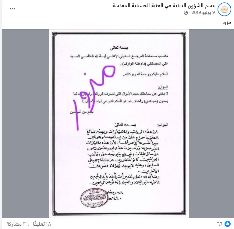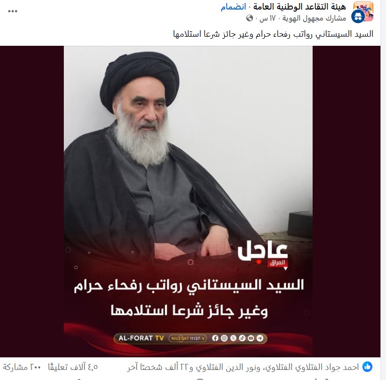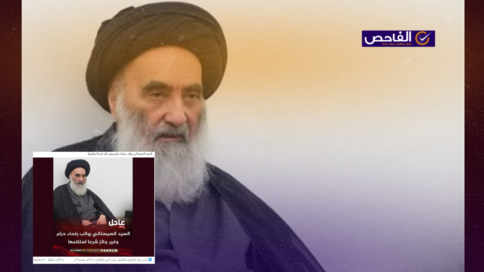 نشرت صفحات على مواقع التواصل الاجتماعي، وخصوصاً على منصة فيسبوك، صورة تحمل قالب قناة “الفرات” الفضائية، مع خبر بمزاعم (دون تصرّف): “السيد السيستاني رواتب رفحاء حرام وغير جائز شرعا استلامها“. وحصد الادعاء أكثر من 22 ألف تفاعل في منشور واحد فقط على منصة فيسبوك.