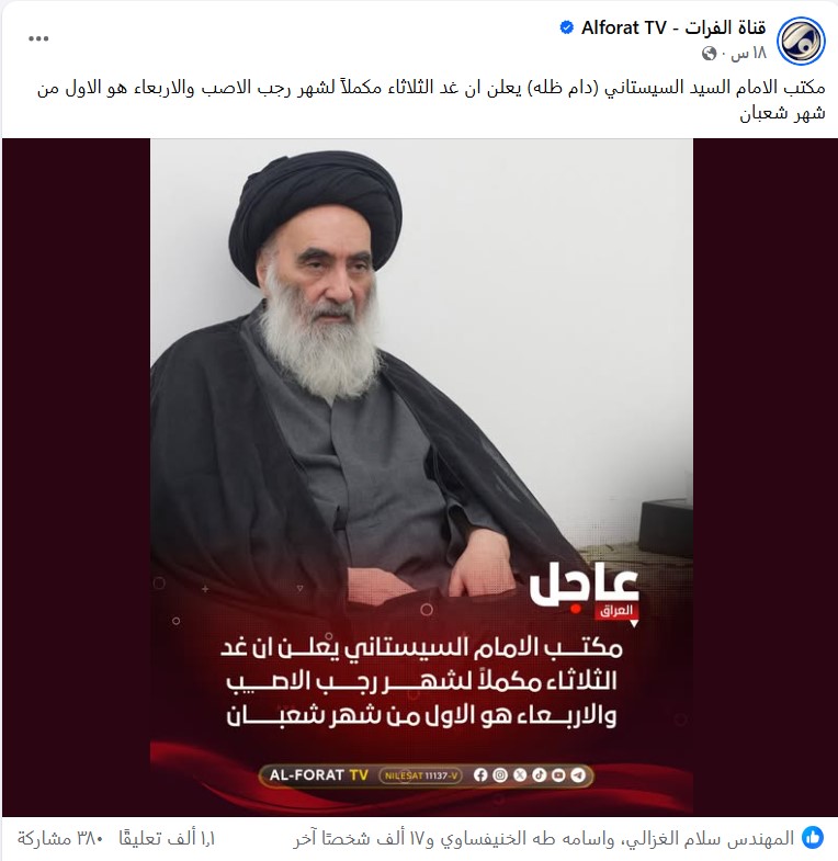 بعد التحقيق من قبل فريق الفاحص، وبالبحث العكسي عن الصورة، اتضح أنها مفبركة وتم التلاعب بها بأحد برامج تعديل الصور باستخدام قالب صور قناة “الفرات الفضائية”، وتم نشر الصورة الأصلية من قبل صفحة القناة على منصة فيسبوك في 19 كانون الثاني 2026، والتي احتوت على خبر مفاده: “مكتب الامام السيد السيستاني (دام ظله) يعلن أن غد الثلاثاء مكملاً لشهر رجب الأصب والأربعاء هو الأول من شهر شعبان”.