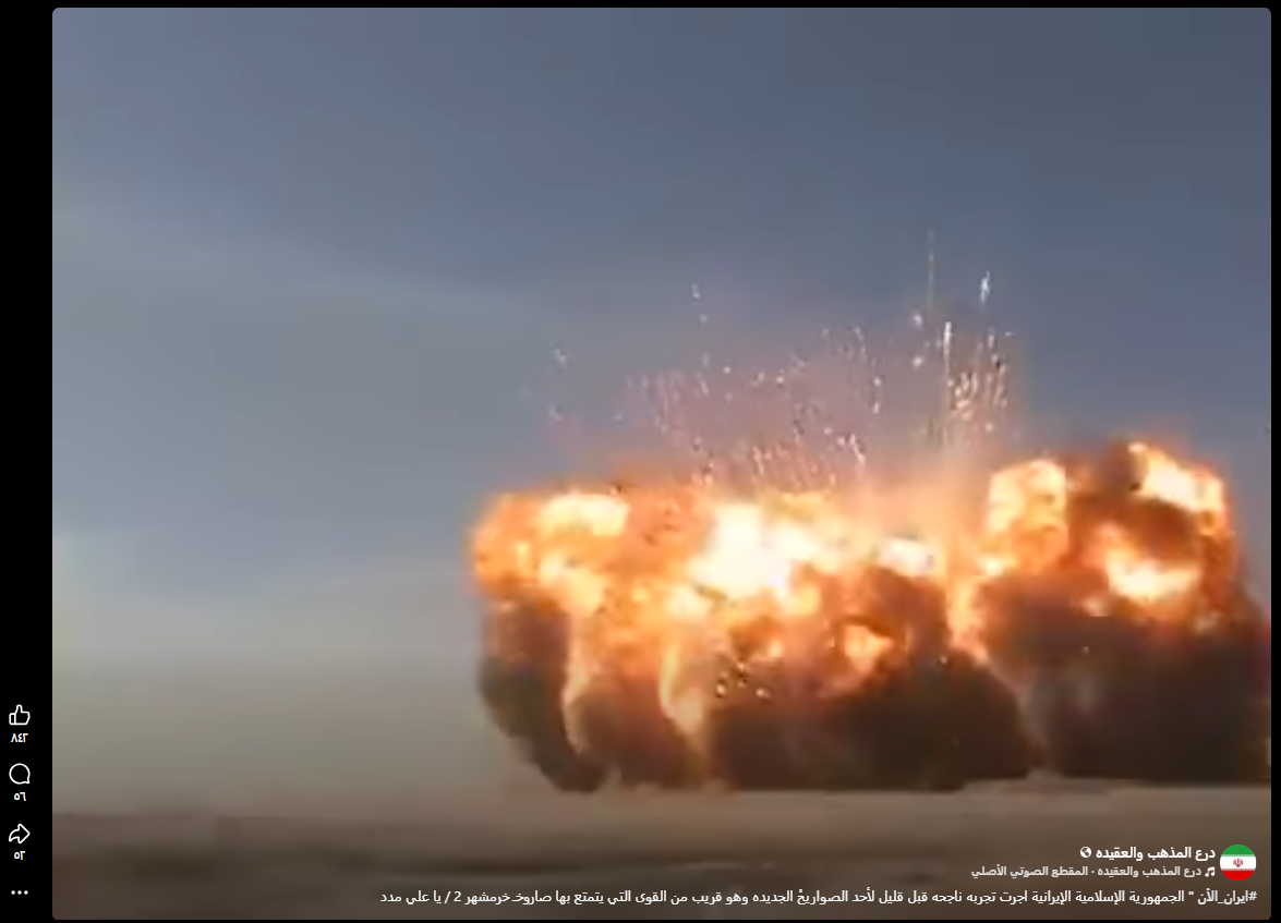 تداولت صفحات على مواقع التواصل الاجتماعي، وخصوصاً على منصة فيسبوك، مقطع فيديو بمزاعم (دون تصرّف): “#ايران_الأن الجمهورية الإسلامية الإيرانية اجرت تجربه ناجحه قبل قليل لأحد الصواريحْ الجديده وهو قريب من القوى التي يتمتع بها صاروخـ خرمشهر 2 / يا علي مدد”. وحصد الادعاء مئات التفاعلات في منشورات متعددة على منصة فيسبوك.
