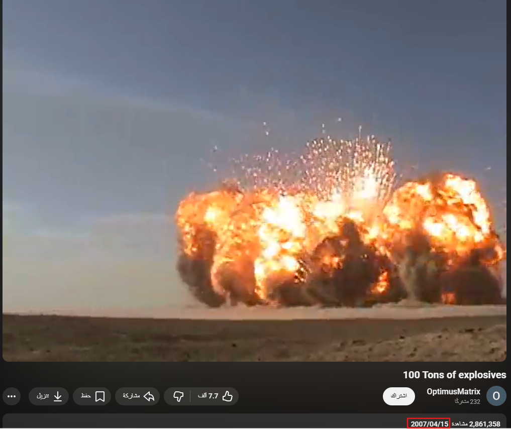 بعد التحقيق من قبل فريق الفاحص، وعبر البحث العكسي، تبين أن الفيديو قديم ونشر في نيسان 2007، من قبل مواقع إلكترونية وحسابات على منصة يوتيوب، وتم تصويره في 22 كانون الثاني 2006 حينما نفذت مجموعة أمنية أميركية، تفجيراً مسيطر عليه لـ100 طن من الذخائر والمتفجرات القديمة. وأشارت المواقع الناشرة إلى أنّ التفجير حصل في العراق.