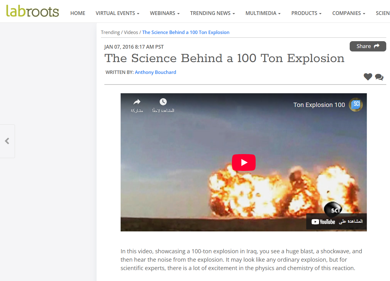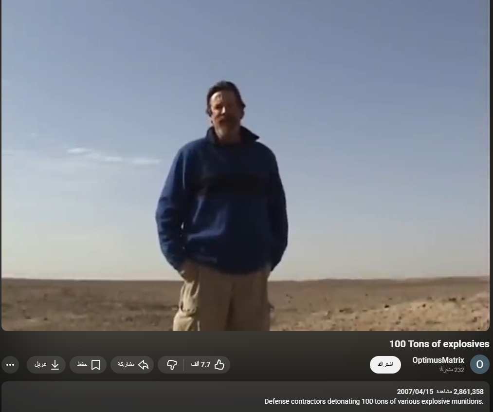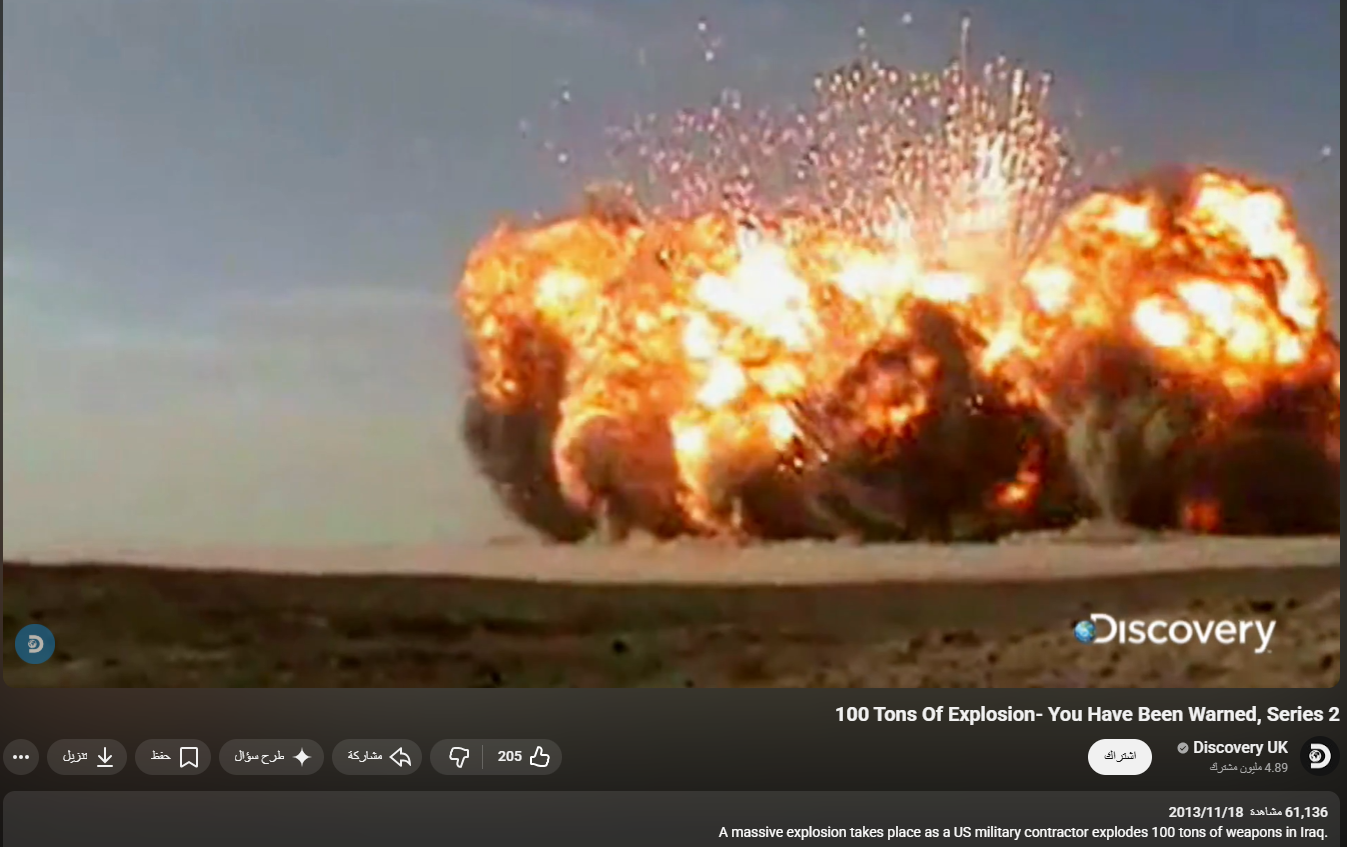 وتظهر النسخة المنشورة على منصة يوتيوب الفيديو كاملاً ويظهر في مقدمته شخص يتحدث اللغة الإنجليزية، ويشير إلى الجمهور بالاستمتاع بمشاهدة عرض تفجير الـ100 طن، كممارسة تقوم بها الشركة. أي ليس له علاقة بأي تجربة إيرانية لسلاح أو صاروخ جديد.