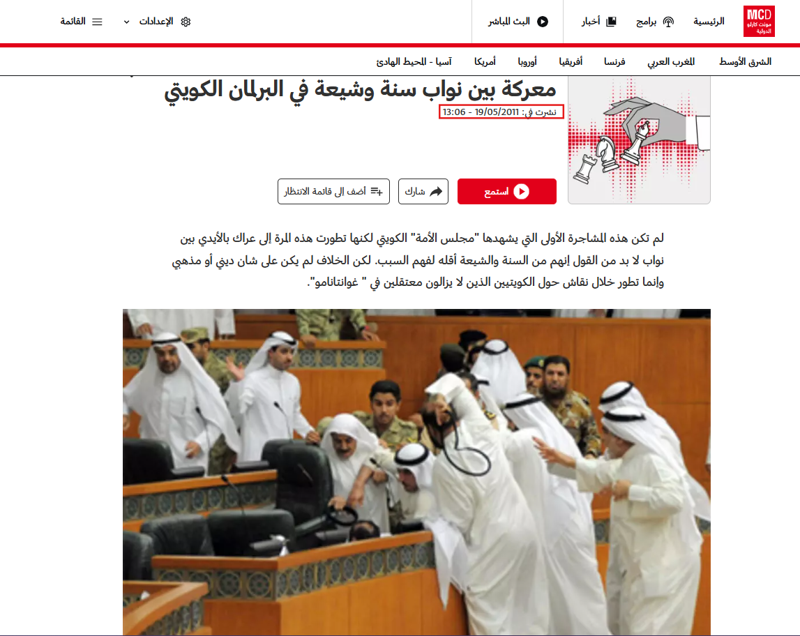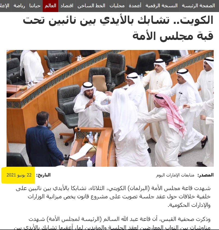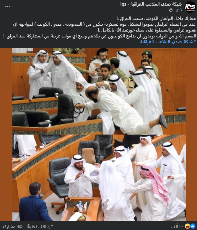 تداولت صفحات على مواقع التواصل الاجتماعي، وخصوصاً على منصة فيسبوك، صور على أنها من داخل مجلس الأمة الكويتي، مرفقة بنص (دون تصرّف): “معارك داخل البرلمان الكويتي بسبب العراق .!عدد من اعضاء البرلمان صوتوا لتشكيل قوة عسكرية تتكون من ( السعودية , مصر , الكويت ) لمواجهة اي هجوم عراقي والسيطرة على ميناء خورعبد الله بالكامل .!القسم الاخر من النواب يريدون ان يدافع الكويتيون عن بلادهم ومنع اي قوات عربية من المشاركة ضد العراق .!”. وحصد الادعاء أكثر من 25 ألف تفاعل في منشور واحد فقط منصة فيسبوك.