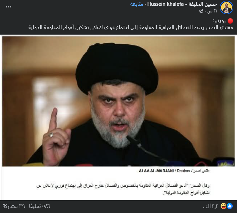 تداولت صفحات على مواقع التواصل الاجتماعي، وخصوصاً على منصة فيسبوك، خبراً بمزاعم (دون تصرّف): “رويترز: مقتدى الصدر يدعو الفصائل العراقية المقاومة إلى اجتماع فوري لاعلان تشكيل أفواج المقاومة الدولية”. وحصد الادعاء أكثر من 2800 تفاعل إلى لحظة إعداد هذا التحقيق، في منشور واحد فقط منصة فيسبوك.