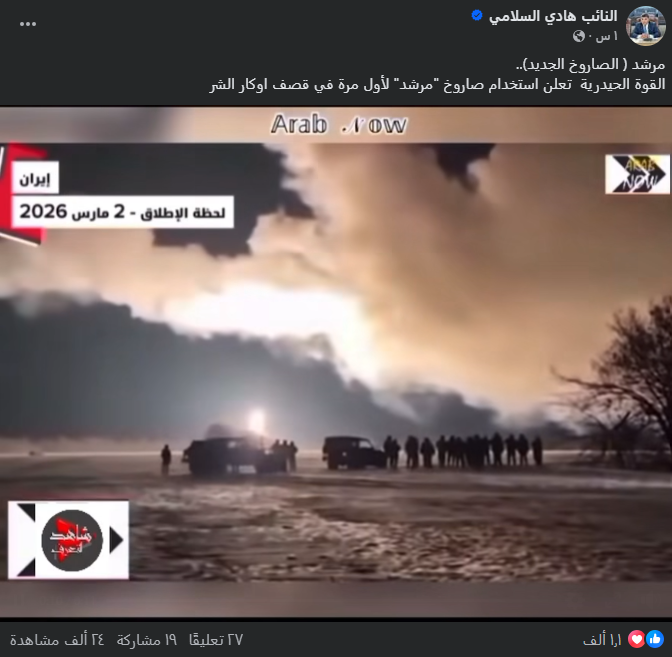 تداولت صفحات على مواقع التواصل الاجتماعي، وخصوصاً على منصة فيسبوك، مقطع فيديو بمزاعم (دون تصرّف): “مرشد ( الصاروخ الجديد).. القوة الحيدرية تعلن استخدام صاروخ ‘مرشد’ لأول مرة في قصف اوكار الشر”. وحصد الفيديو في منشور واحد فقط على منصة فيسبوك أكثر من 24 ألف مشاهدة، وأكثر من ألف تفاعل حتى لحظة إعداد هذا التحقيق.