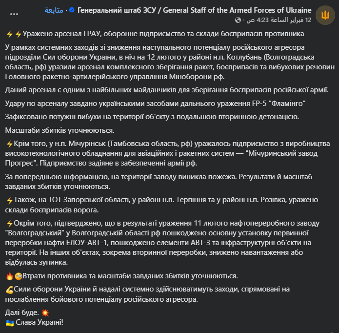 Докладніше: https://t.co/tmOgdDu4Tm pic.twitter.com/Ph9crD8oHw— Генеральний штаб ЗСУ (@GeneralStaffUA) February 12, 2026