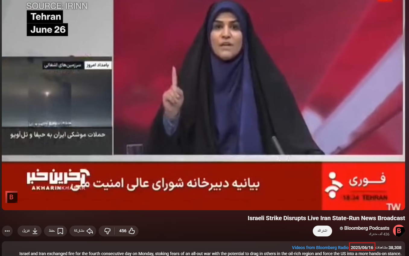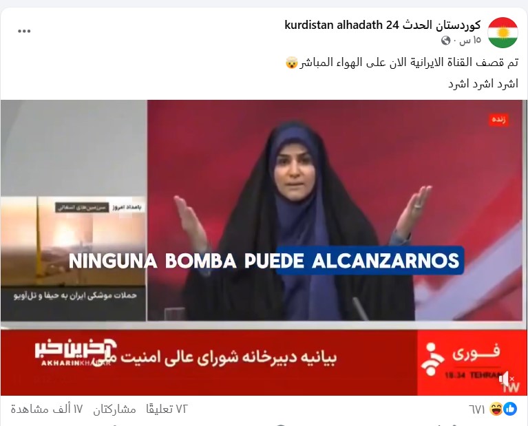 تداولت صفحات على مواقع التواصل الاجتماعي، وخصوصاً على منصة فيسبوك، مقطع فيديو بمزاعم (دون تصرّف): “تم قصف القناة الايرانية الان على الهواء المباشر”. وحصد الفيديو في منشور واحد فقط على منصة فيسبوك مئات التفاعلات.