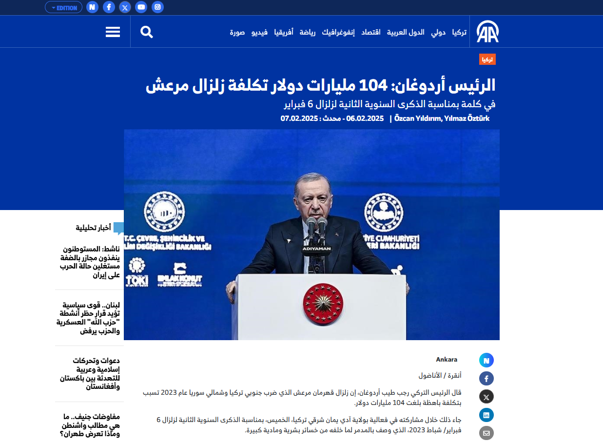 وحينذاك، ضرب زلزال جنوبي تركيا وشمالي سوريا مركزه كهرمان مرعش، بلغت قوته 7.7 درجات، أعقبه آخر بعد ساعات بقوة 7.6 درجات، ومئات الهزات الارتدادية العنيفة، وشملت آثار الزلزال 124 قضاء و6 آلاف و929 قرية ضمن 11 ولاية تركية، بينما بلغ عدد المتضررين منه 14 مليون شخص في تركيا وحدها.