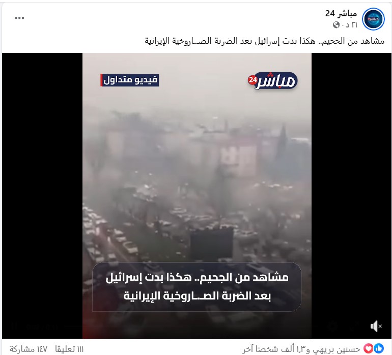 تداولت صفحات على مواقع التواصل الاجتماعي، وخصوصاً على منصة فيسبوك، مقطع فيديو بمزاعم (دون تصرّف): “مشاهد من الجحيم.. هكذا بدت إسرائيل بعد الضربة الصـ.ـاروخية الإيرانية”. وحصد الفيديو في منشور واحد فقط على منصة فيسبوك أكثر من 100ألف مشاهدة، وأكثر من 1500 تفاعل حتى لحظة إعداد هذا التحقيق.