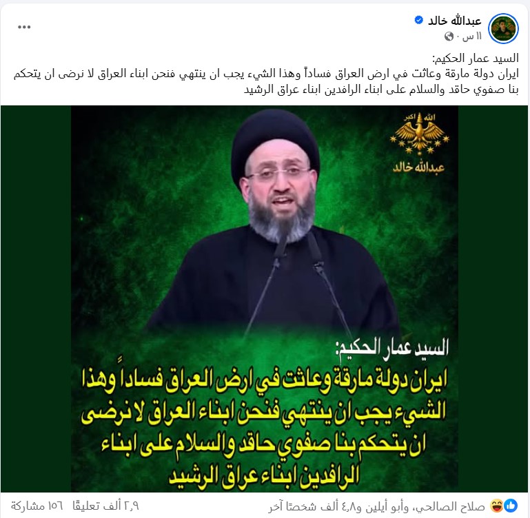 تداولت صفحات على مواقع التواصل الاجتماعي، وخصوصاً على منصة فيسبوك، تصريحاً منسوباً إلى زعيم “تيار الحكمة الوطني”، عمار الحكيم، على أنَّه قال (دون تصرّف): “ايران دولة مارقة وعاثت في ارض العراق فساداً وهذا الشيء يجب ان ينتهي فنحن ابناء العراق لا نرضى ان يتحكم بنا صفوي حاقد والسلام على ابناء الرافدين ابناء عراق الرشيد“. وحصد منشور واحد فقط على منصة فيسبوك أكثر من 9 آلاف تفاعل حتى لحظة إعداد هذا التحقيق.