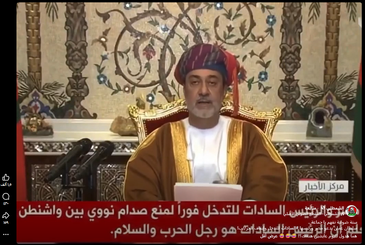 وتتبّع الفريق أصل الفيديو، ليتّضح أنَّه يعود إلى خطاب تنصيب السلطان هيثم بن طارق بتاريخ 23 شباط 2020، وهو خطاب وُجّه إلى الشعب العُماني لتحديد ملامح الحكم، ولم يرد فيه ذكر للرئيس المصري الراحل أنور السادات أو أي دعوة لتدخّل عسكري مزعوم.