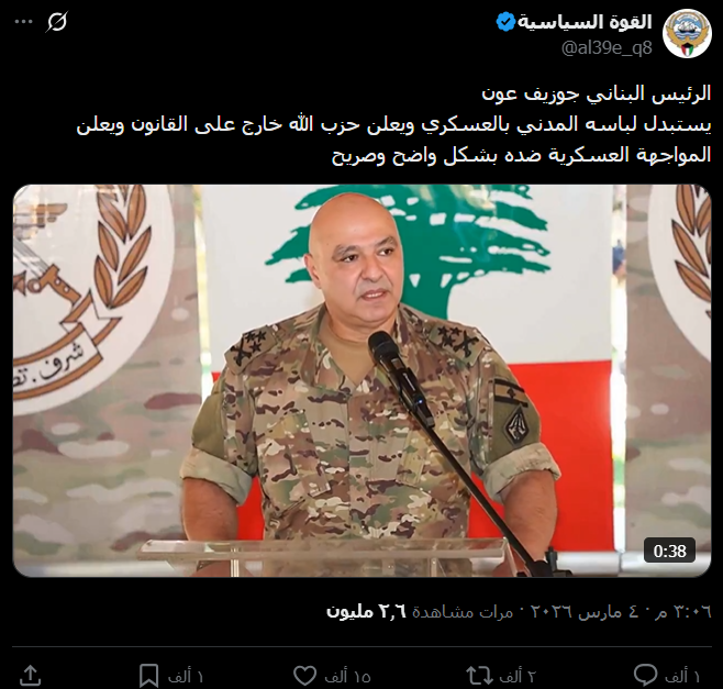 يستبدل لباسه المدني بالعسكري ويعلن حزب الله خارج على القانون ويعلن المواجهة العسكرية ضده بشكل واضح وصريح pic.twitter.com/QxbfPcMLAF— القوة السياسية (@al39e_q8) March 4, 2026