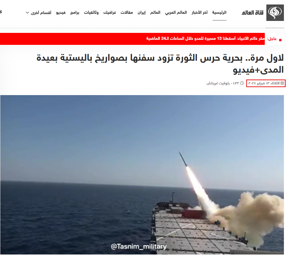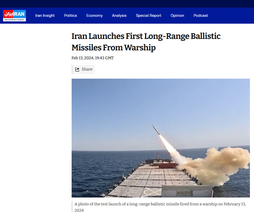 ونقلت وسائل إعلام إيرانية مثل “إيران انترناشيونال” في 13 شباط 2024 خبراً بعنوان: “إيران تطلق أول صواريخ باليستية طويلة المدى من سفينة حربية”، وهو ما تم استغلاله بشكل مضلل في الادّعاء المتداول عبر ربطه باستهداف ناقلة أميركية حديثاً.
