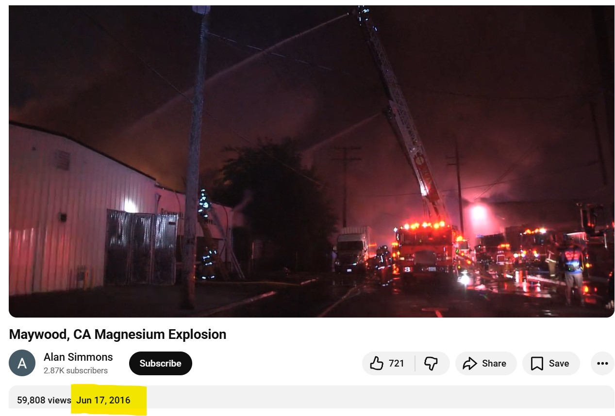 بعد التحقيق من قبل فريق الفاحص، والبحث عكسياً عن الفيديو عبر محرك غوغل، تبين أنه قديم، إذ نشر في 17 حزيران 2016، في قناة على منصة يوتيوب بعنوان (Maywood, CA Magnesium Explosion) وهو لحادث حريق اندلع في مصنع لإعادة التدوير على الحدود بين مدينتي فيرنون ومايوود بولاية كاليفورنيا الأميركية، وليس كما تم الادعاء.