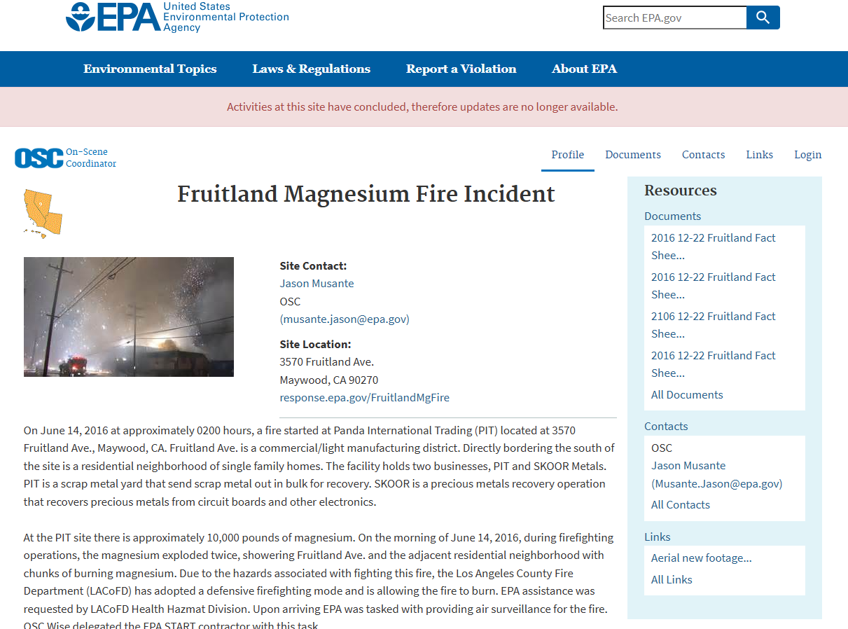 وأصدرت آنذاك وكالة حماية البيئة الأميركية، بياناً حول الحادثة أوضحت فيه أنَّه يوجد قرابة 10,000 رطل من المغنيسيوم في موقع الحادث، وأثناء عمليات مكافحة الحريق انفجر المغنيسيوم مرتين، مما أدى إلى تساقط قطع من المغنيسيوم المحترق كالمطر على شارع فروتلاند والحي السكني المجاور.