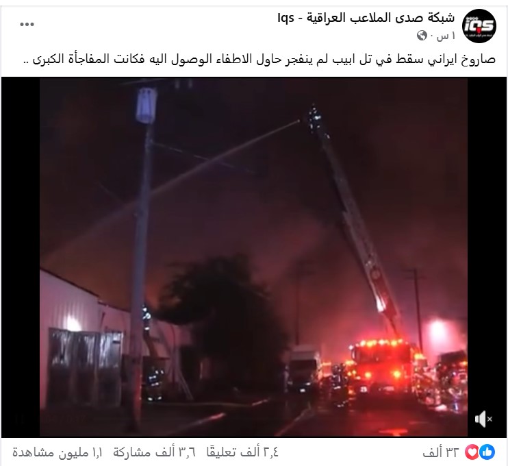 تداولت صفحات على مواقع التواصل الاجتماعي، وخصوصاً على منصة فيسبوك، مقطع فيديو مرفق بنص (دون تصرّف): “ صاروخ ايراني سقط في تل ابيب لم ينفجر حاول الاطفاء الوصول اليه فكانت المفاجأة الكبرى.”. وحصد الفيديو في منشور واحد فقط على منصة فيسبوك أكثر من مليون مشاهدة، وأكثر من 40 ألف تفاعل حتى لحظة إعداد هذا التحقيق.