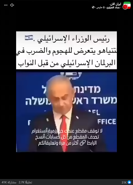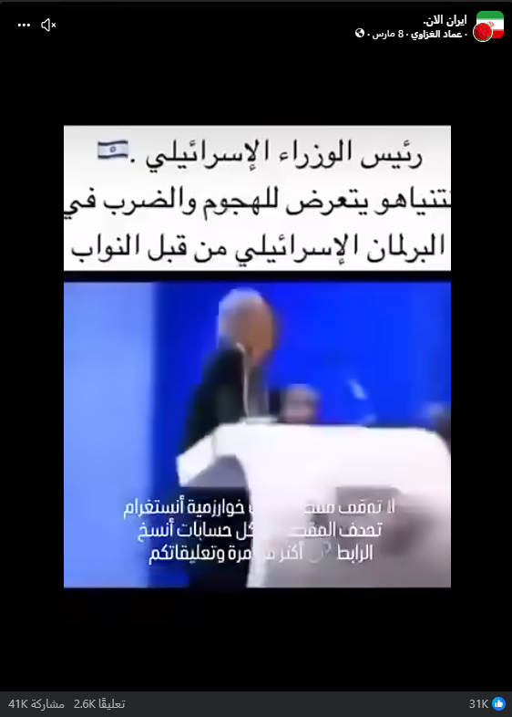 تداولت صفحات على مواقع التواصل الاجتماعي، وخصوصاً على منصة فيسبوك، مقطع فيديو بمزاعم (دون تصرّف): “رئيس الوزراء الإسرائيلي.. نتنياهو يتعرض للهجوم والضرب في البرلمان الإسرائيلي من قبل النواب”. وحصد الفيديو في منشور واحد فقط على منصة فيسبوك أكثر من 74 ألف تفاعل حتى لحظة إعداد هذا التحقيق.